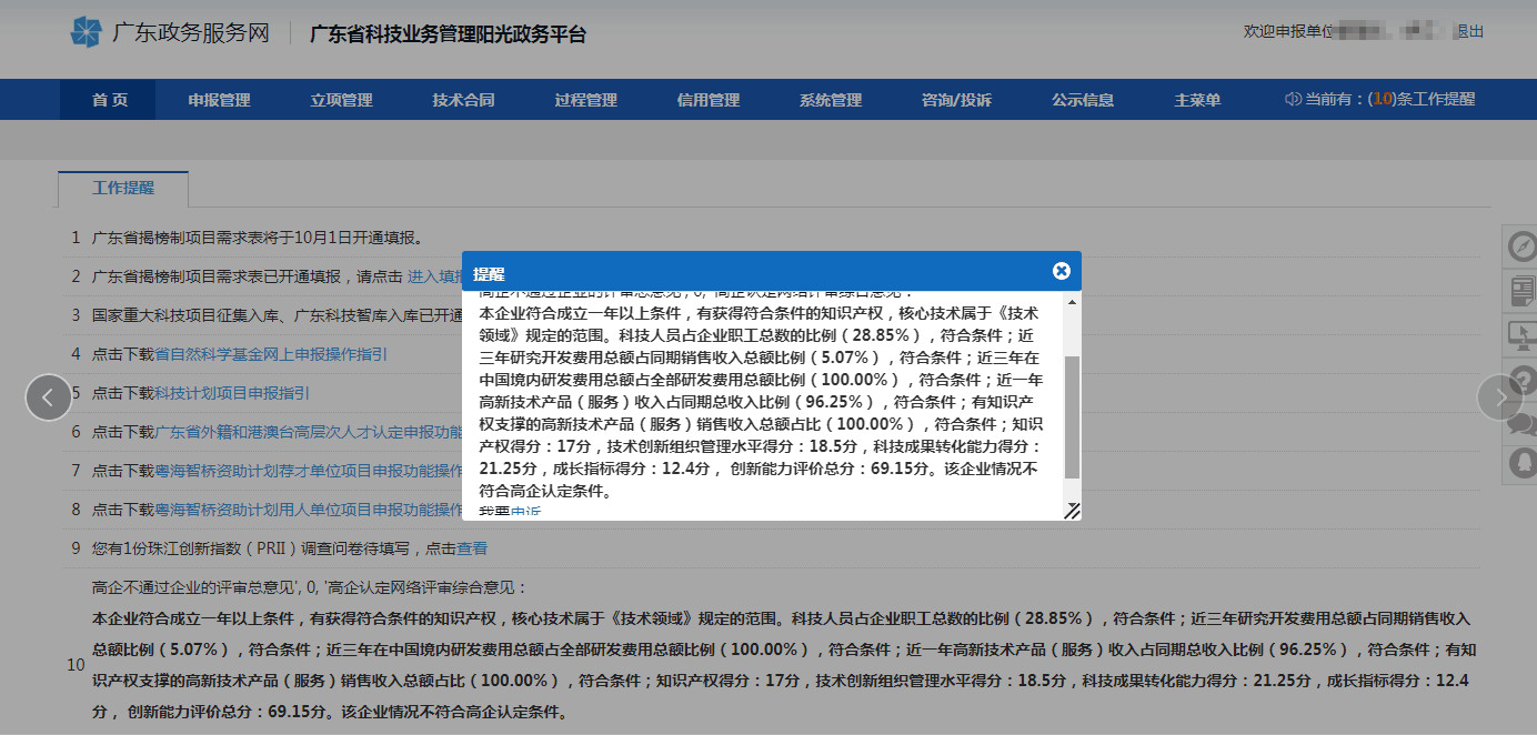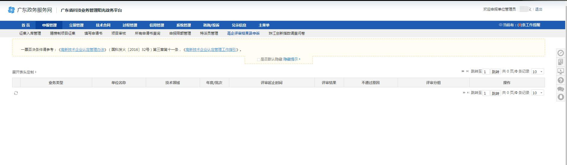 可通過【申報管理-項目申請-高企評審結果及申訴】查看