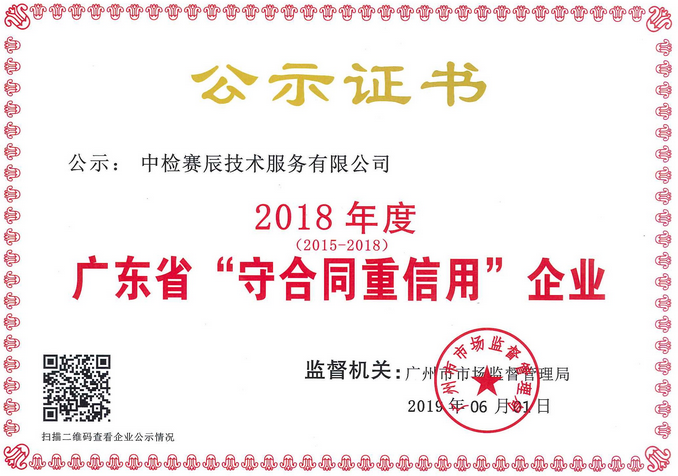 日前,廣東省市場監(jiān)督管理局正式公示了2018年度“廣東省守合同重信用企業(yè)”名單,中檢賽辰技術(shù)服務(wù)有限公司憑借良好的信譽與契約精神順利通過評審,已連續(xù)四年(2015-2018)獲得此項殊榮,同時彰顯了中檢賽辰企業(yè)的信用體系建設(shè)及維護合同信用等方面得到工商和市場監(jiān)管部門的高度認可。