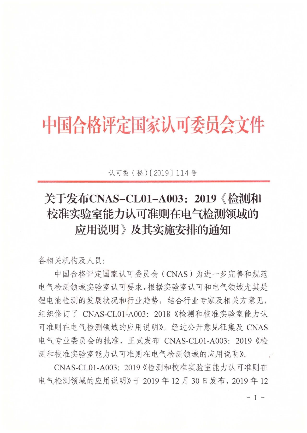 關(guān)于發(fā)布CNAS-CL01-A003:2019《檢測和校準(zhǔn)實驗室能力認(rèn)可準(zhǔn)則在電氣檢測領(lǐng)域的應(yīng)用說明》及其實施安排的通知