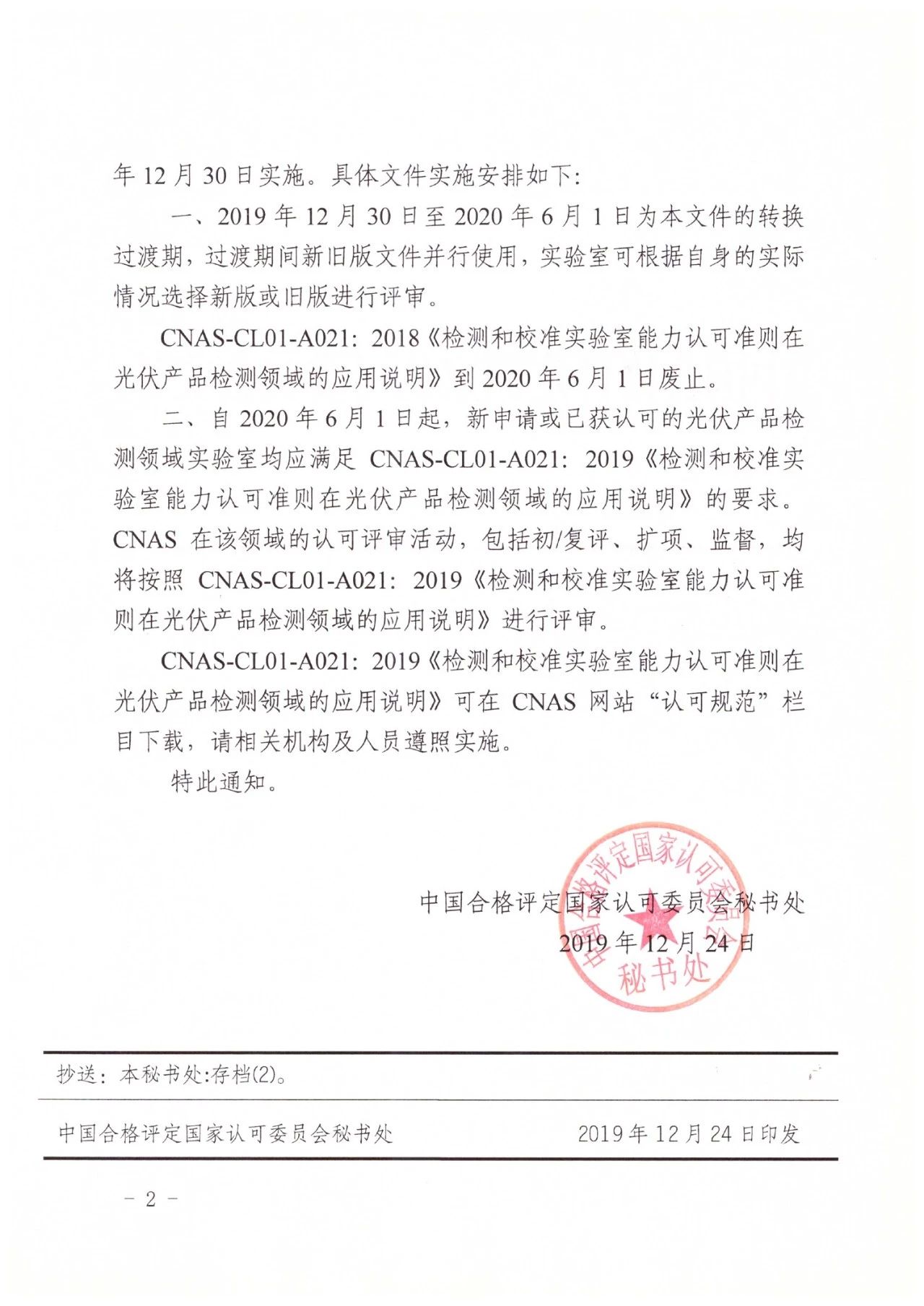關(guān)于發(fā)布CNAS-CL01-A021:2019《檢測和校準(zhǔn)實驗室能力認(rèn)可準(zhǔn)則在光伏產(chǎn)品檢測領(lǐng)域的應(yīng)用說明》及其實施安排的通知