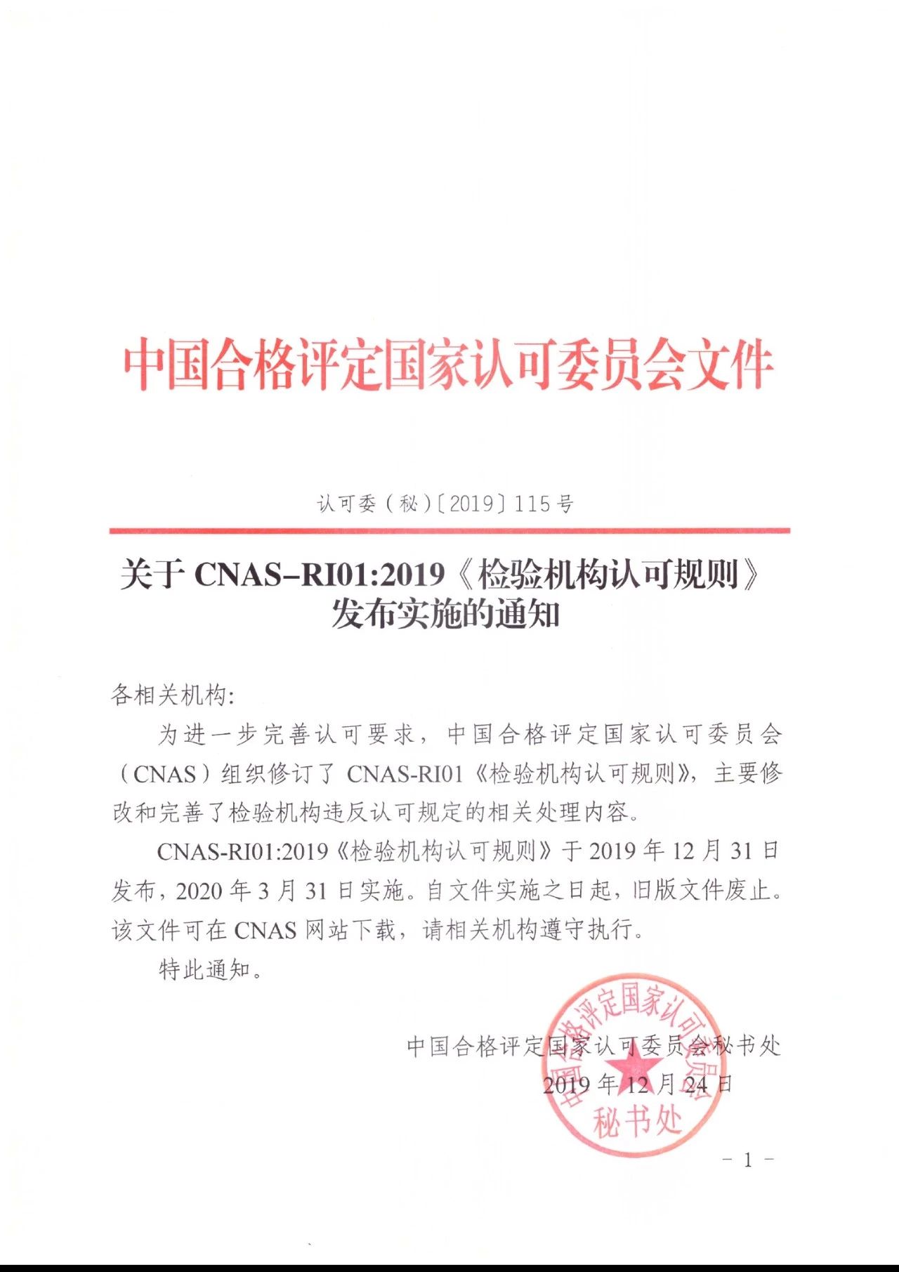 關(guān)于CNAS-RI01:2019《檢驗機(jī)構(gòu)認(rèn)可規(guī)則》發(fā)布實施的通知